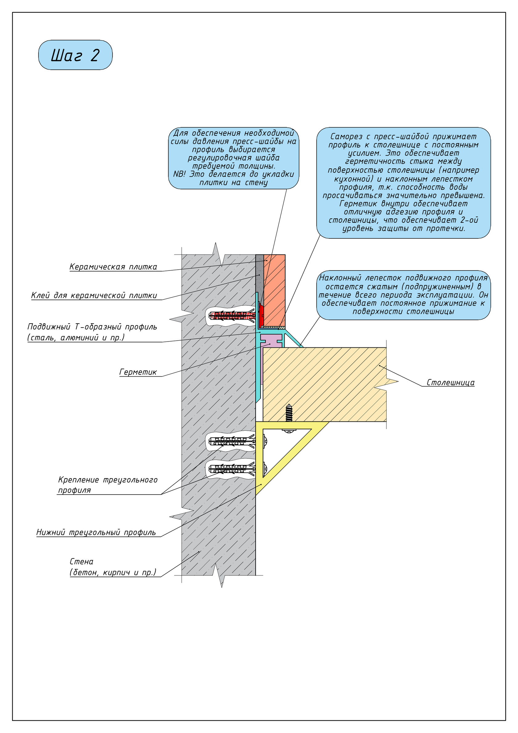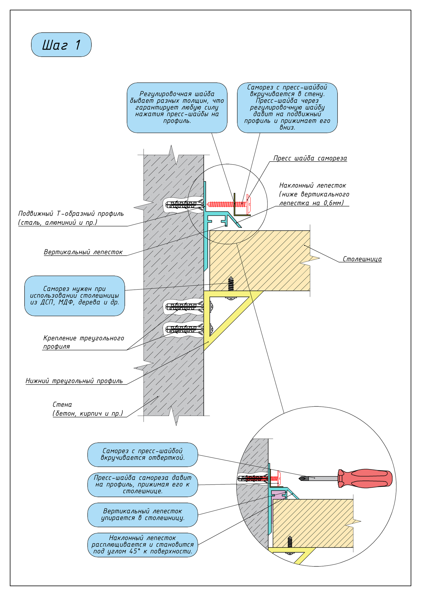 Установка начинается с механического прижатия. Сначала к стене помещения на уголки крепится столешница. Между стеной и столешницей остается небольшой зазор в 2 мм. Затем сверху в этот зазор вставляется Гермоплинтус, который является подвижным профилем. После чего, в просверленные отверстия в стене вкручиваются саморезы, которые своими пресс-шайбами заставляют профиль прижиматься вниз (см. чертеж). Чтобы не повредить профиль при установке используются регулировочные шайбы, которые также позволяют регулировать силу прижатия профиля к поверхности столешницы.